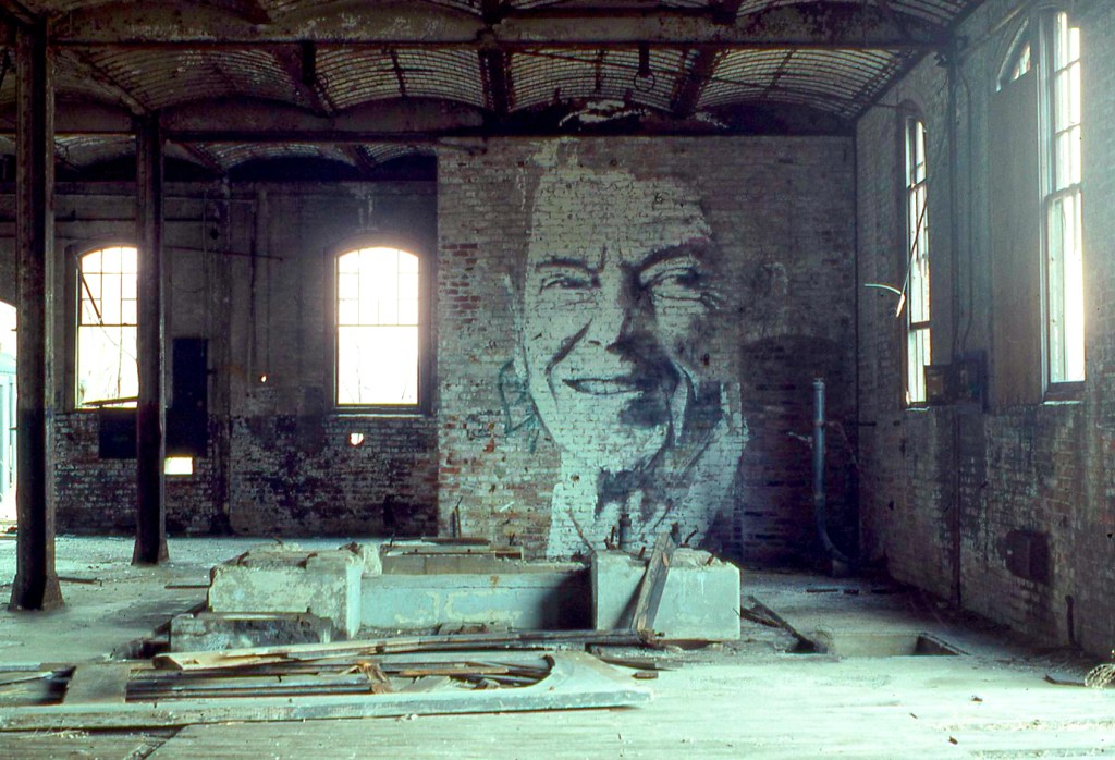 Painting this thing was great. It was freezing and my hands were frozen stiff. The wall was 12’ high. I was trying to get a likeness with house paint and a paint roller. Didn’t know who would walk in on me. Got it done in 4 hours (fast!) and the only thing anyone ever did to it was paint the whites of the eyes red. Which was an excellent finishing touch.